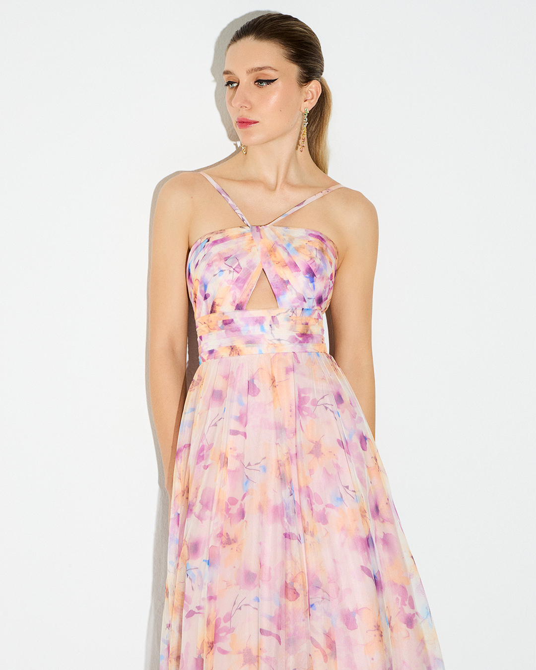 Κοκτείλ φόρεμα μακρύ εμπριμέ τούλι με άνοιγμα στο τοπ